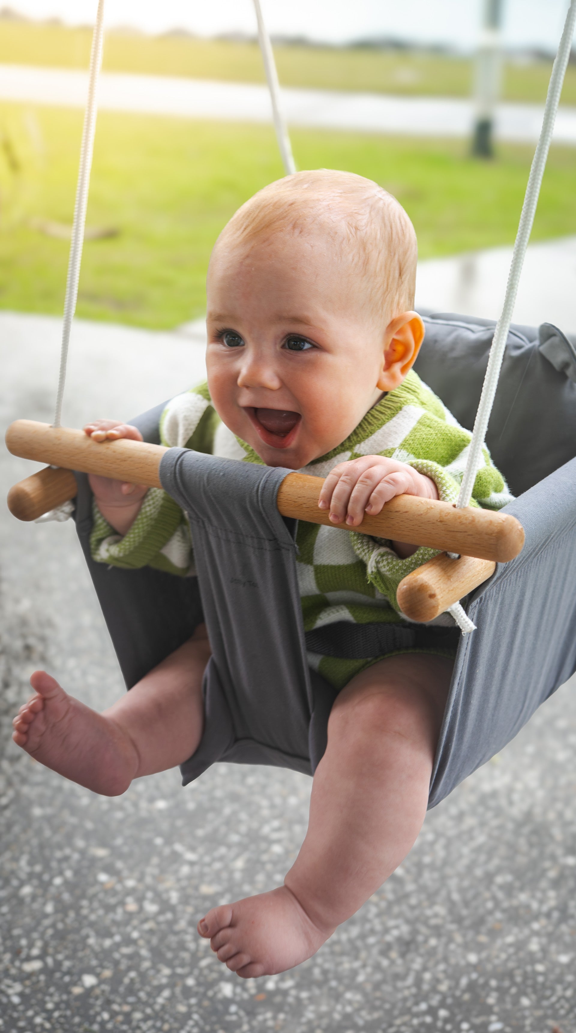Bring comfort, style, and smiles to your home with this modern charcoal grey baby swing. Designed with soft cotton canvas and smooth natural wood, it’s perfect for little ones who love to sway, giggle, and explore from the safety of their seat.